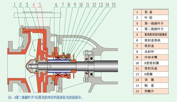 UHB-ZK-AB型耐腐耐磨泵是對UHB-ZK-A系列泵的改進型泵(見上圖)。兩者之間的區別在于后者是無臺階式背葉片,前者為臺階式背葉片結構(見圖中序號4)。改進后的葉輪的背葉分為二級,二級背葉片之間有凸起臺階。與之相匹配的泵也有凹進的臺階。設置背葉輪臺階的目的是阻斷泵出口流體壓力對軸密封的返流壓力,保證和延長軸密封的使用壽命。