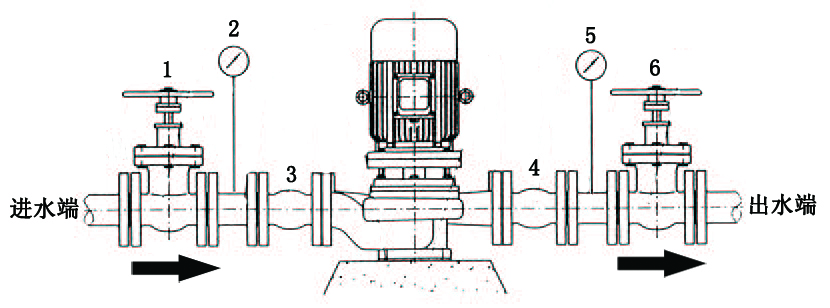 1、管道泵:管道泵是進出口在同一直線上且口徑相同的離心泵,可像一段管道串聯安裝在管道的任何位置故取名為管道泵。其是根據泵的外形特診來定義命名的,若根據原理命名,管道泵是特殊結構的離心泵,而普通的離心泵可能是臥式端吸式的,也可能是立式多級離心式的。如下圖1:
