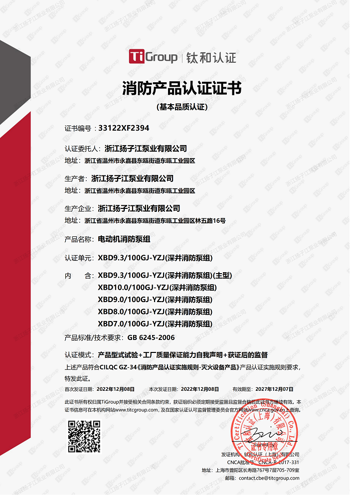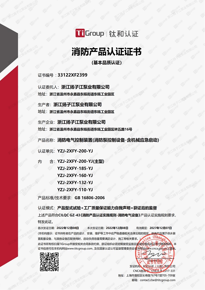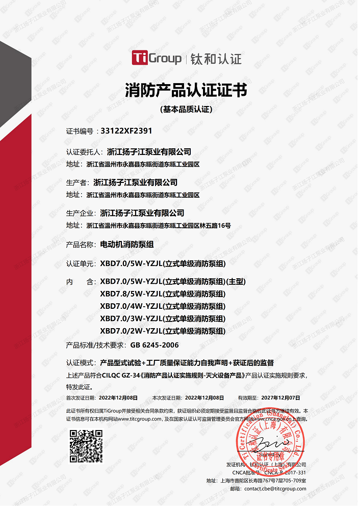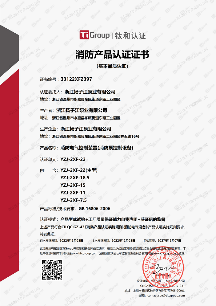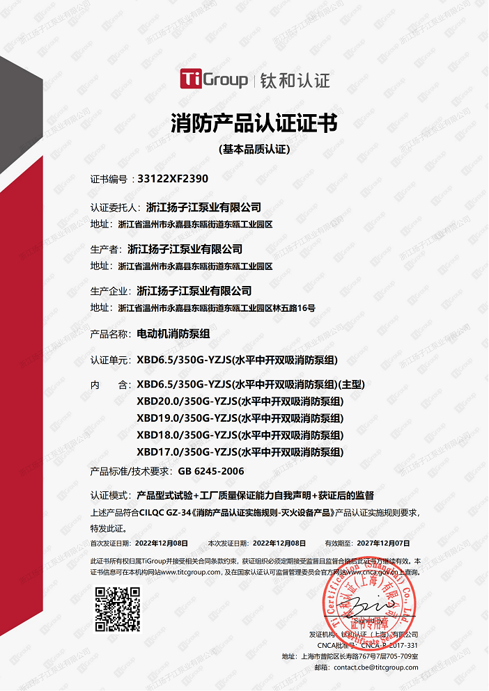 日前,浙江揚(yáng)子江泵業(yè)順利通過消防泵柴油機(jī)消防泵穩(wěn)壓成套及控制柜消防電氣控制裝置消防產(chǎn)品認(rèn)證.
