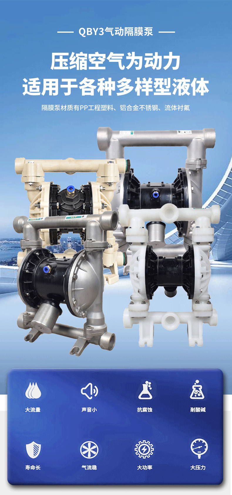 QBY系列氣動隔膜泵是一種新型輸送機(jī)械,是目前國內(nèi)新穎的一種泵類。采用空氣壓縮機(jī)壓縮空氣為動力源,對于各種腐蝕性液體,帶顆粒的液體,高粘度、易揮發(fā)、易燃、劇毒的液體,均能予以抽光吸盡。其性能參數(shù)與聯(lián)邦德國的 WLLDENPVMPS、美國的MARIOWPUMPS相近.本廠目前已形成系列化生產(chǎn)
