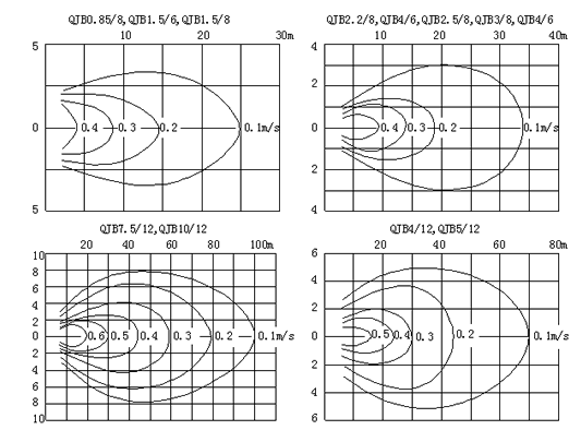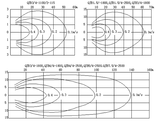 潛水攪拌機的選型是一項比較復雜的工作,選型的正確與否直接影響設備的正常使用,作為選型的原則就是要讓潛水攪拌機在適合的容積里發揮充分的攪拌功能,一般可用流速來確定。根據污水處理廠不同的工藝要求,潛水攪拌機佳流速應保證在0.15~0.3m/s之間,如果低于0.15m/s的流速則達不到推流攪拌效果,超過0.3m/s的流速則會影響工藝效果且造成浪費。所以在選型前首先確定QJB潛水攪拌機運用的場所,如:污水池、污泥池、生化池;其次是介質的參數,如:懸浮物含量、粘度、溫度、PH值;還有水池的形狀、水深甚至安裝方式等都對選型產生影響,同時還應考慮到節能因素,因為這將影響到用戶今后的運行成本。可參考下面的潛水攪拌機流場圖。