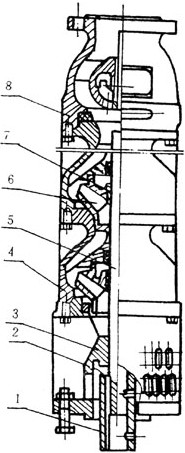 2、潛水泵每級(jí)導(dǎo)流殼中裝有一個(gè)橡膠軸承;葉輪用錐形套固定在泵軸上;導(dǎo)流殼采用螺紋或螺栓聯(lián)成一體。