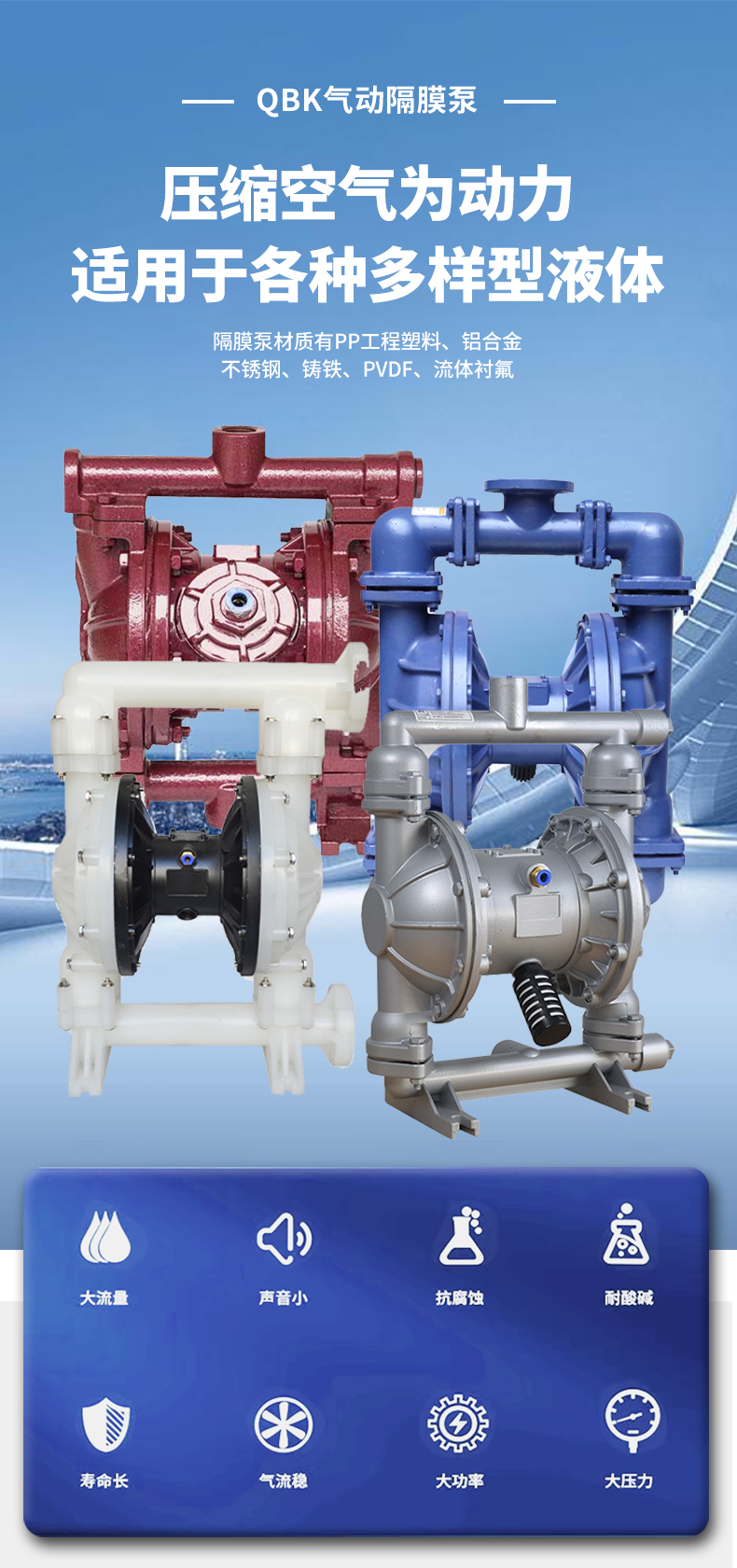 QBK氣動隔膜泵是我公司開發的第三代氣動隔膜泵,具有使用壽命長,不會停頓等優點,它既能抽送流動的液體,又能輸送一些不易流動的介質,具有自吸泵、潛水泵、屏蔽泵、泥漿泵和雜質泵等輸送機械的許多優點。
